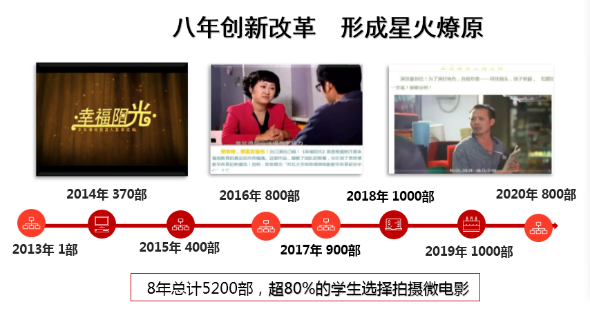 在“繁星奖”河北大学思政课微电影大赛中,教师们指导学生获得各类各级奖励近400项。通过微电影教学法,培养学生运用理论解决问题的能力、创造美与体验美的能力、沟通协作能力、实践与创新能力和自我教育能力。