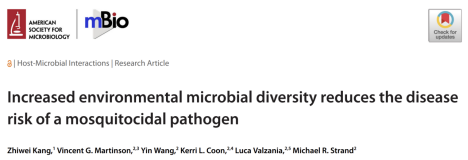 2023年12月6日,河北大学生命科学学院孙江华课题组青年教师康志伟在美国微生物学会旗舰刊物mBio杂志(中科院1区Top)上发表题为“Increased environmental microbial diversity reduces the disease risk of a mosquitocidal pathogen”的研究论文(doi: 10.1128/mbio.02726-23),揭示了生境微生物的组成和多样性在抑制病原细菌过量增殖中的作用机制。