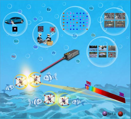 镧系掺杂应力发光材料因其独特的力—光转换特性而备受关注。现有体系的应力发光范围主要集中在380–1540nm波段,仅略微延伸至紫外区域,这限制了它们在日盲成像、无背景追踪、隐蔽通信、紧急指示与救援等领域的应用。为解决这一难题,研究团队基于在紫外—尤其是深紫外领域内的多年探索与积累,通过分析基质影响下Pr3+的复杂能级结构,建立了远紫外C波段应力发光的通用设计准则。基于此,团队开发出一类Pr3+掺杂SrF2样品,借助Pr3+的5d→4f跃迁,实现了中心波长约为222 nm的远紫外C波段应力发光。此外,SrF2基质还对多种镧系离子发光中心(Ce3+、Nd3+、Sm3+、Eu2+/3+、Gd3+、Tb3+、Dy3+、Ho3+、Er3+、Tm3+和Yb3+)表现出包容性,均实现了应力发光效果,覆盖了200–1700 nm全光谱范围。考虑到太阳光中的紫外C成分已被臭氧层完全吸收,研究团队展示了所设计的远紫外C应力发光体系在无背景标记、结构健康监测等方面的潜在应用。
